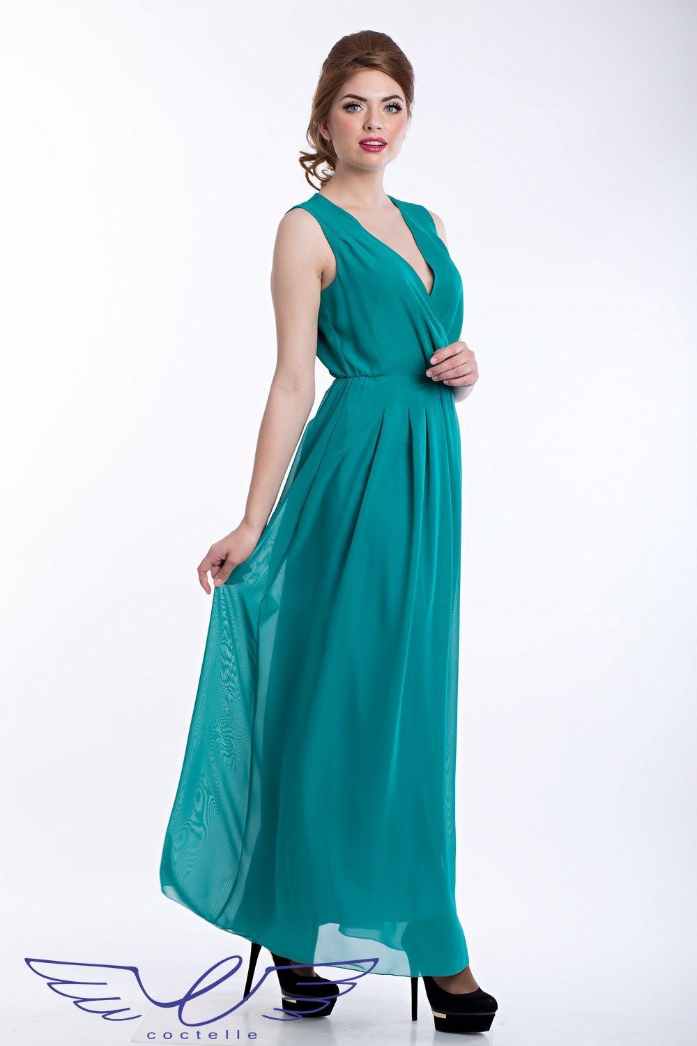 Шикарное длинное шифоновое платье с V-образным запашным вырезом без рукавов с притачной пышной юбкой со складками. Легкость и нежность шифона вне конкуренции!!! (Платье на легком подкладе) Ткань: шифон.