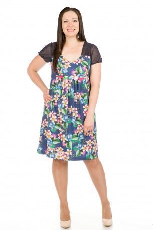 Длина изделия: 92 см Состав: 30% вискоза 65% ПЭ 5% лайкра Вес: 0,3 кг Летнее нарядное трикотажное платье с ярким цветочным принтом. V образная горловина, подрез под линией груди, украшен декоративными элементами ( см. фото), короткий рукав, выполнен из двойной сетки и собран на шпульную резину по низу.Платье имеет свободный силуэт от линии груди. Декор выполнен из цветных пластиковых камней и репсовой ленты.Кокетка по спинке из сетки синего цвета.