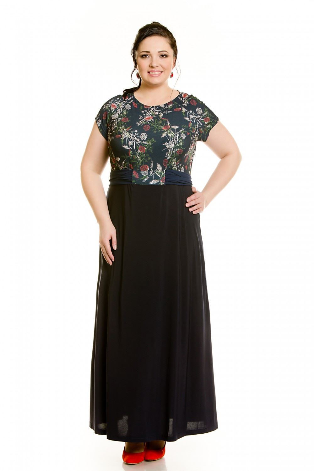 Длинное вечернее платье в сочетании трех тканей: темно синего, цветочного трикотажного полотна и однотонного шифона. Достаточно простого покроя верх изделия, расклешенная к низу юбка и богатый шифоновый пояс, который каждая покупательница может завязывать на свое усмотрение.Спущенный рукав, платье без застежки, круглая горловина.