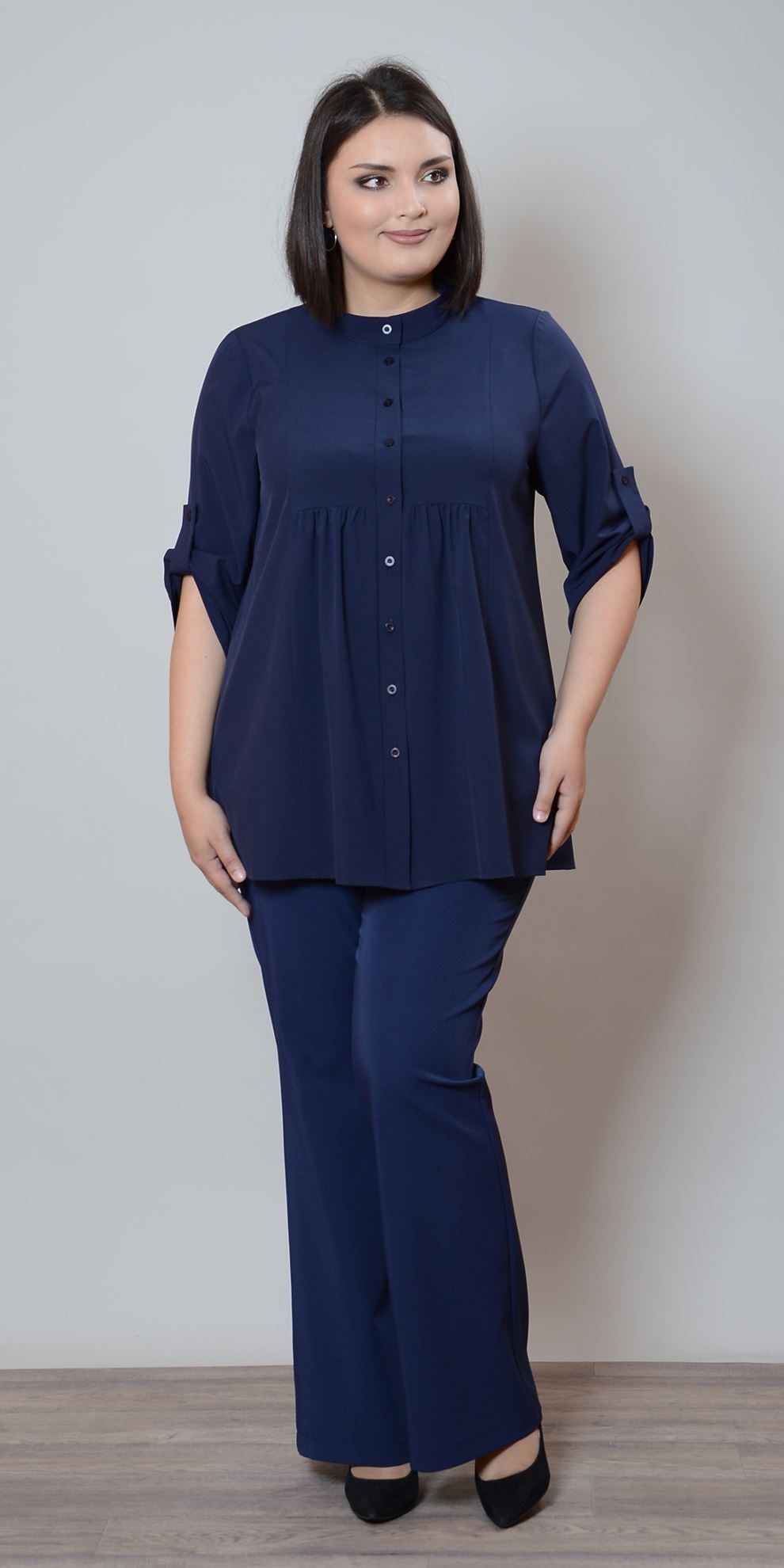 Комфортная блуза А-образного силуэта слегка расклешенного к низу. Воротник-стойка плавно переходит в застежку на петли и пуговицы. Отрезная линия груди с мелкой сборкой. Втачные рукава 7/8 присобраны на паты, с помощью которых можно регулировать длину.