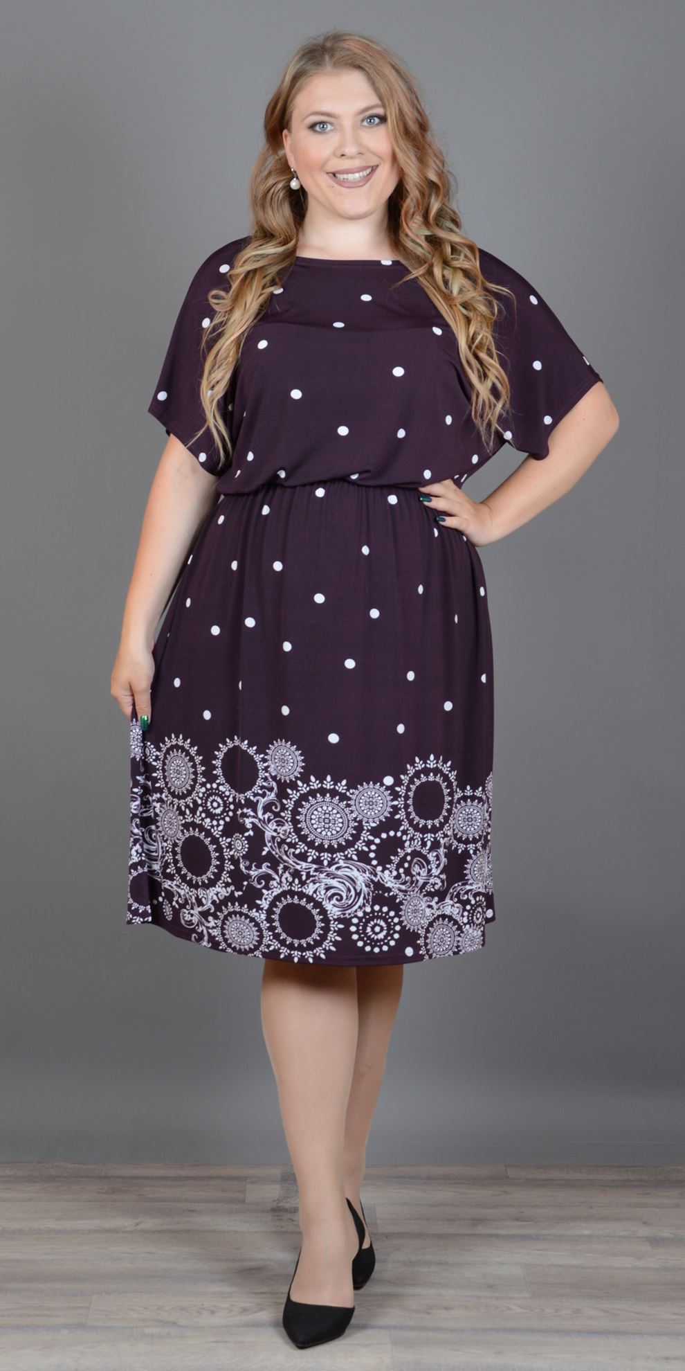 Яркое трикотажное платье с оригинальным принтом. Изделие полуприлегающего силуэта, отрезное по талии, присобрано на резинке. Горловина «лодочка» слегка расширена к плечам. Короткий цельнокроеный рукав, придаёт свободу движения. Стильная модель практична в носке и выполнена с учётом особенностей фигуры для дам нестандартных размеров.